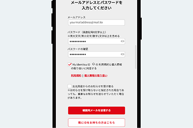 メールアドレス、パスワードを入力し、My idemitsu IDの利用規約と個人情報の取り扱いに同意するにチェックを入れ、確認用メールを送信するを選択します。